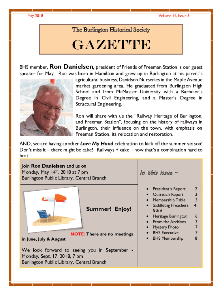 May 2018Volume 14, Issue 5The Burlington Historical SocietyGazette BHS member, Ron Danielsen, president of Friends of Freeman Station is our guest speaker for May. Ron was born in Hamilton and grew