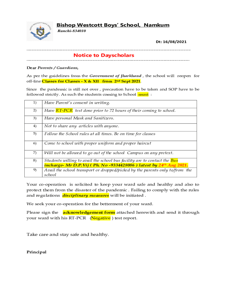 As per the guidelines from the Government of Jharkhand, the school will reopen for