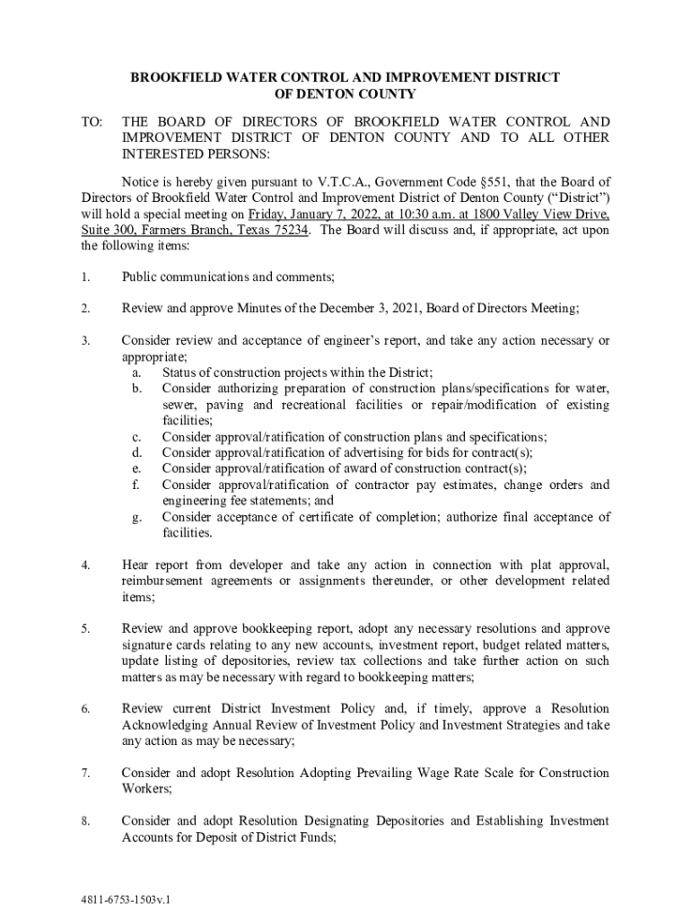 BROOKFIELD WATER CONTROL AND IMPROVEMENT DISTRICT OF DENTON COUNTY TO:THE BOARD OF DIRECTORS OF BROOKFIELD WATER CONTROL AND IMPROVEMENT DISTRICT OF DENTON COUNTY AND TO ALL OTHER INTERESTED PERSONS:Notice
