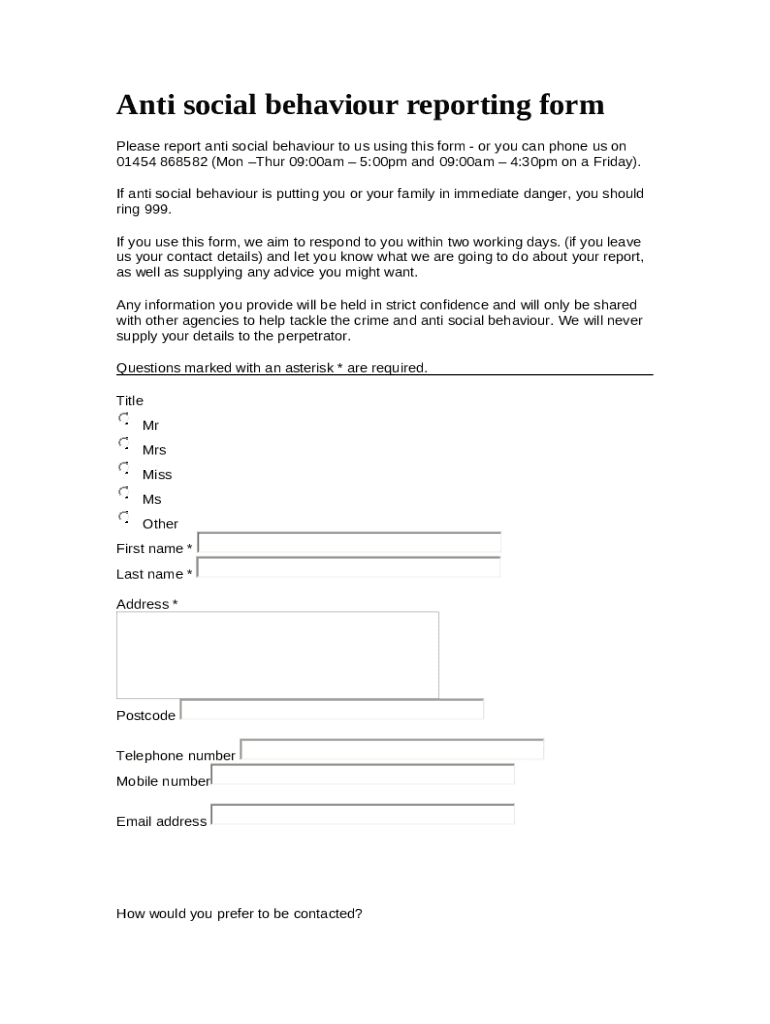 The Anti-social behaviour reporting is a writable document you can get filled-out and signed for certain reasons. Then, it is furnished to the exact addressee in order to provide some info of certain kinds. The completion and signing can be done in hard copy by hand or using a suitable service e. g. PDFfiller. These tools help to send in any PDF or Word file without printing out. It also allows you to edit its appearance for your requirements and put a legal digital signature. Once done, you send the Anti-social behaviour reporting to the recipient or several ones by mail and even fax. PDFfiller provides a feature and options that make your Word template printable. It offers a variety of options for printing out appearance. It doesn't matter how you distribute a form after filling it out - in hard copy or by email - it will always look well-designed and clear. To not to create a new file from the beginning all the time, make the original Word file into a template. After that, you will have a customizable sample.