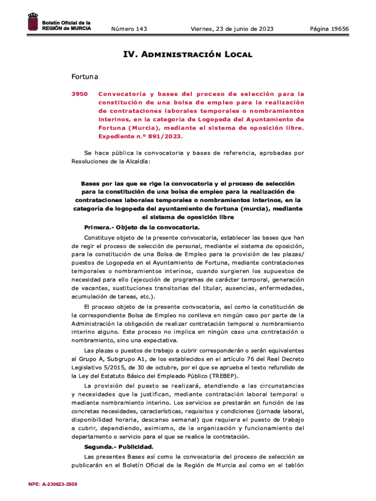 Nmero 143Viernes, 23 de junio de 2023IV. Administracin Local Fortuna 3950Convocatoria y bases del proceso de seleccin para la constitucin de una bolsa de empleo para la realizacin de contrataciones