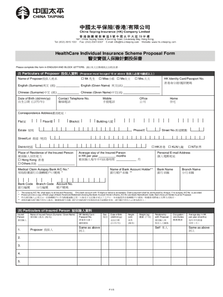 HealthCare Individual Insurance Scheme Proposal Form Please complete this form in ENGLISH AND BLOCK LETTERS. (I) Particulars of Proposer (Proposer must be aged 18 or above 18 Mr.Name of Proposer Miss
