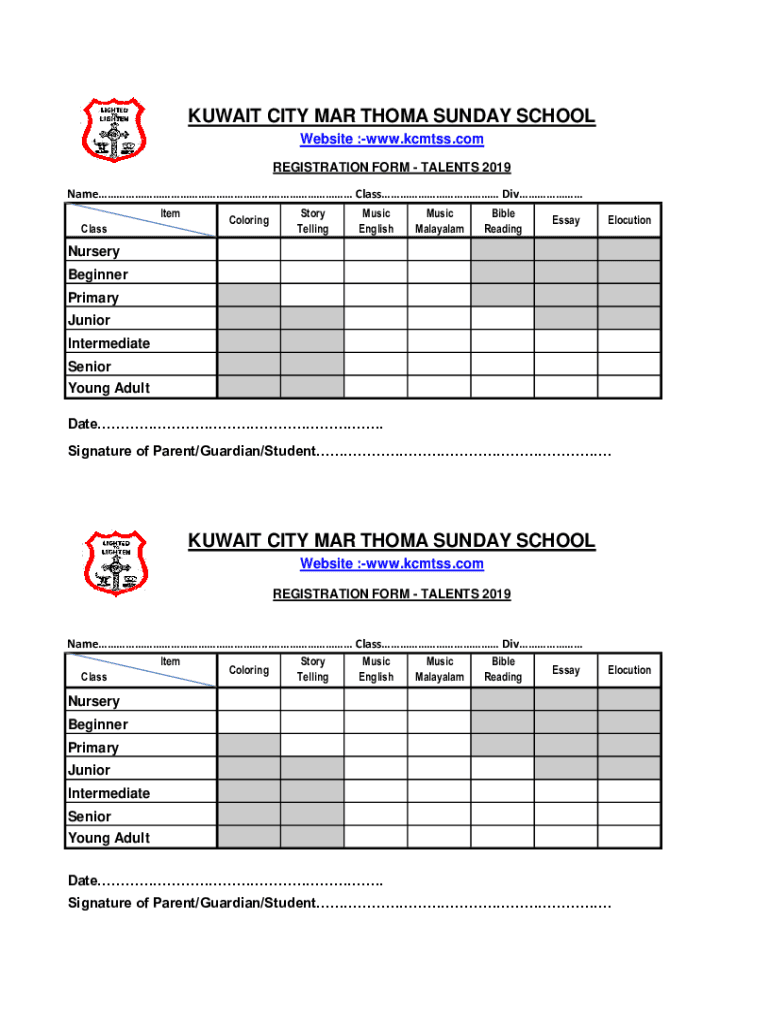 KUWAIT CITY MAR THOMA SUNDAY SCHOOL Website :www.kcmtss.com REGISTRATION FORM TALENTS 2019 Name... Class Div Item ClassColoringStory TellingMusic EnglishMusic MalayalamBible ReadingEssayElocutionNursery