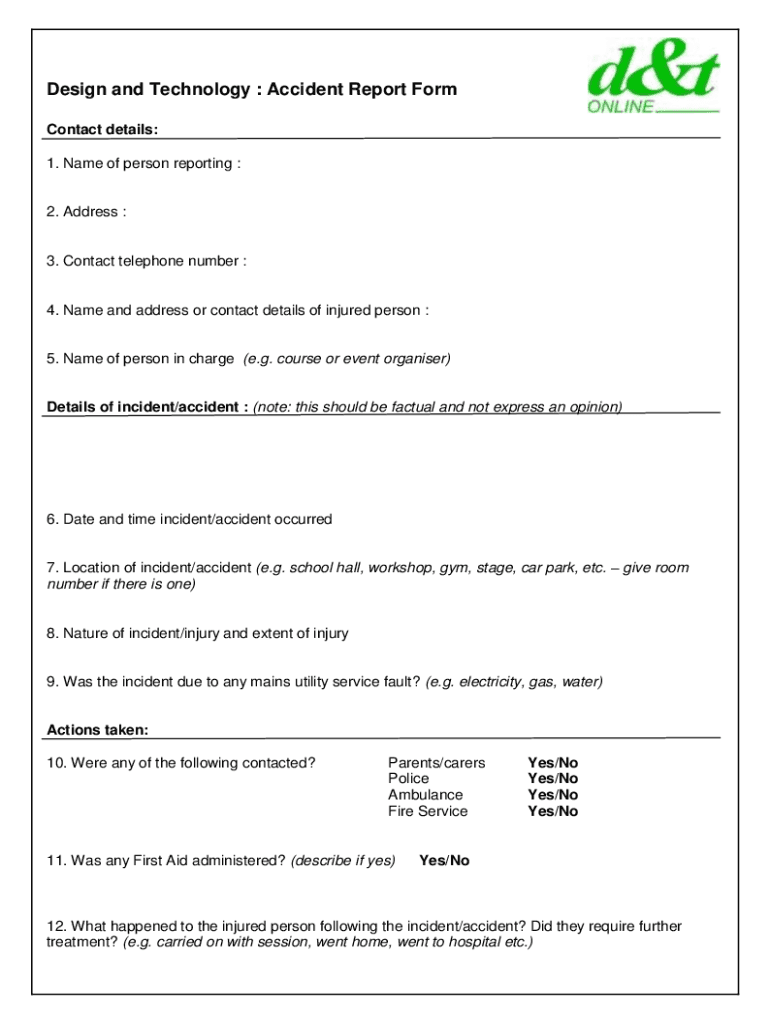 Design and Technology : Accident Report Form Contact details: 1. Name of person reporting :2. Address :3. Contact telephone number :4. Name and address or contact details of injured person :5. Name