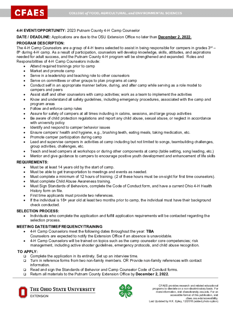 4H EVENT/OPPORTUNITY: 2023 Putnam County 4H Camp Counselor DATE / DEADLINE: Applications are due to the OSU Extension Office no later than December 2, 2022. PROGRAM DESCRIPTION: The 4H Camp Counselors