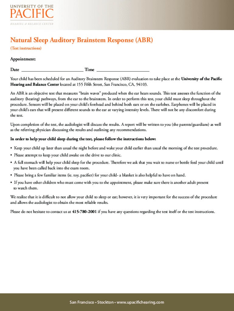 HEARING & BALANCE CENTERNatural Sleep Auditory Brainstem Response (ABR) (Test instructions)Appointment: Date ___ Time ___ Your child has been scheduled for an Auditory Brainstem Response (ABR) evaluation
