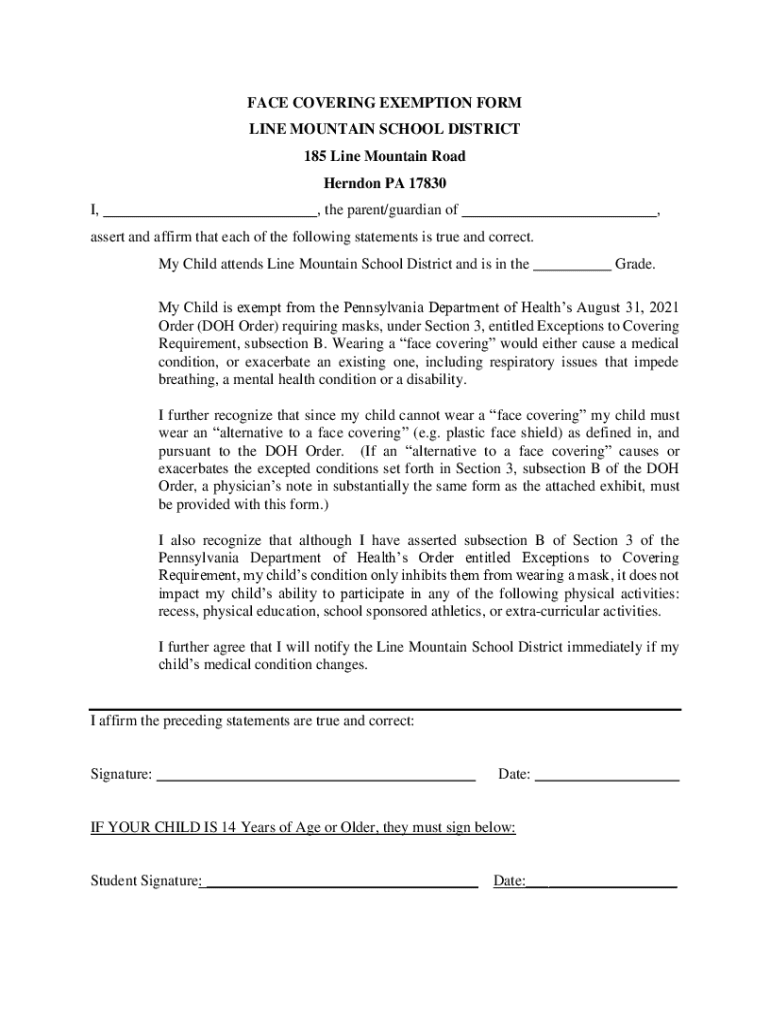 FACE COVERING EXEMPTION FORM LINE MOUNTAIN SCHOOL DISTRICT 185 Line Mountain Road Herndon PA 17830 I,, the parent/guardian of,assert and affirm that each of the following statements is true and correct.