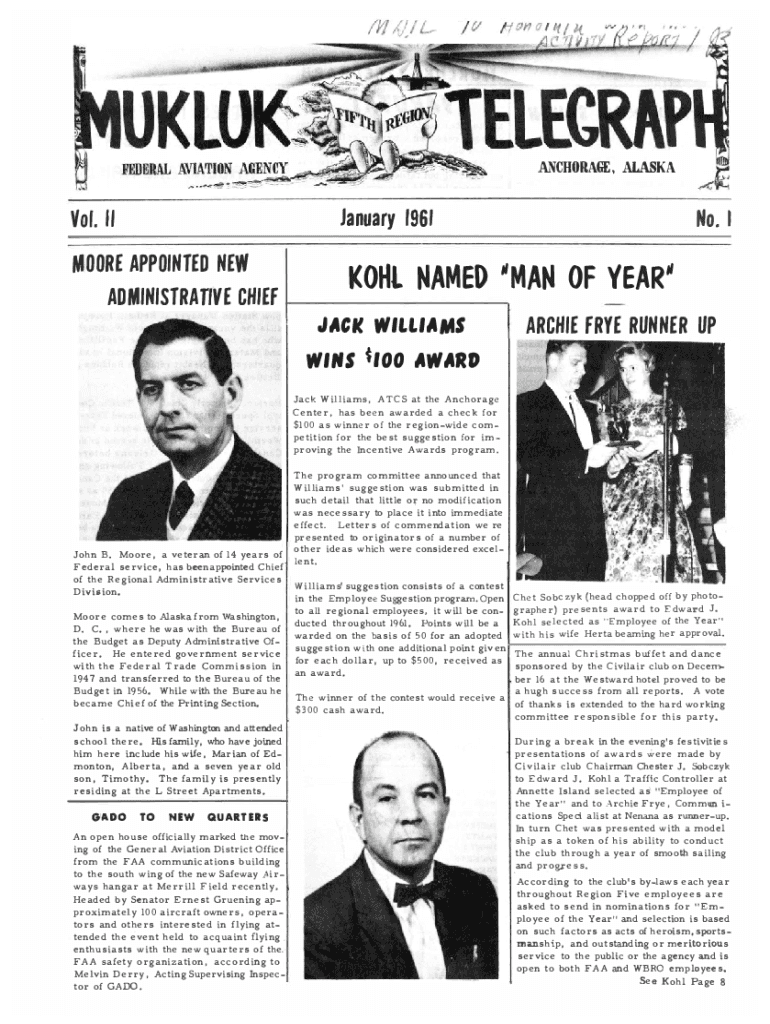 ANCHORAGE, ALASKAJanuary 196fVol. II MiOORE APPOINTED NEW ADMINISTRA Tl\'VE CHIEFNo. IKOHl NAMED \'MAN OF YEAR\' JACK WILLIAMSARCHIE FRYE RUNNER UPWINS t100 AWARD Jack Williams, ATCS at the Anchorage