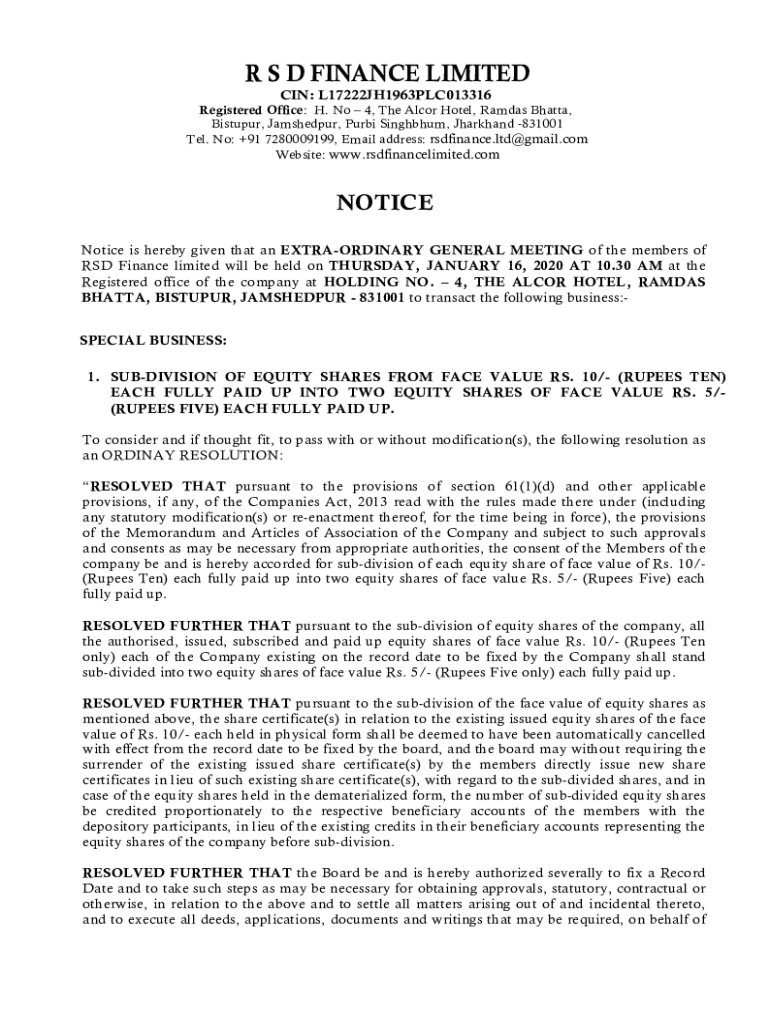 R S D FINANCE LIMITED CIN: L17222JH1963PLC013316 Registered Office: H. No 4, The Alcor Hotel, Ramdas Bhatta, Bistupur, Jamshedpur, Purbi Singhbhum, Jharkhand 831001 Tel. No: +91 7280009199, Email