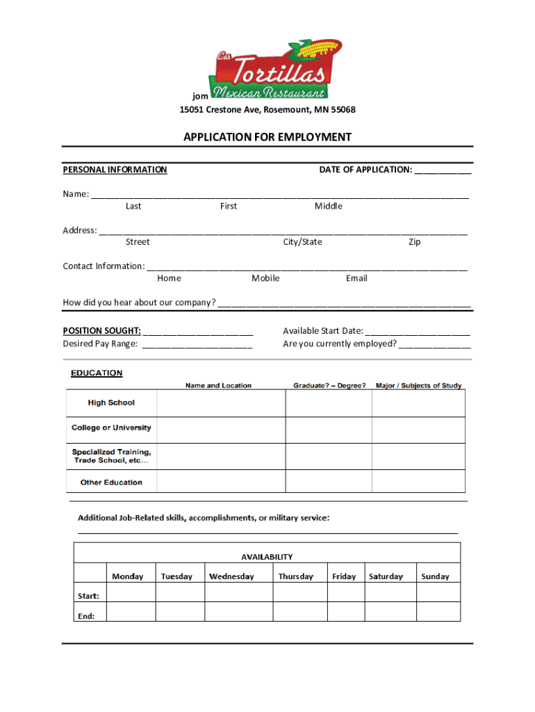15051 Crest one Ave, Rose mount, MN 55068APPLICATION FOR EMPLOYMENT