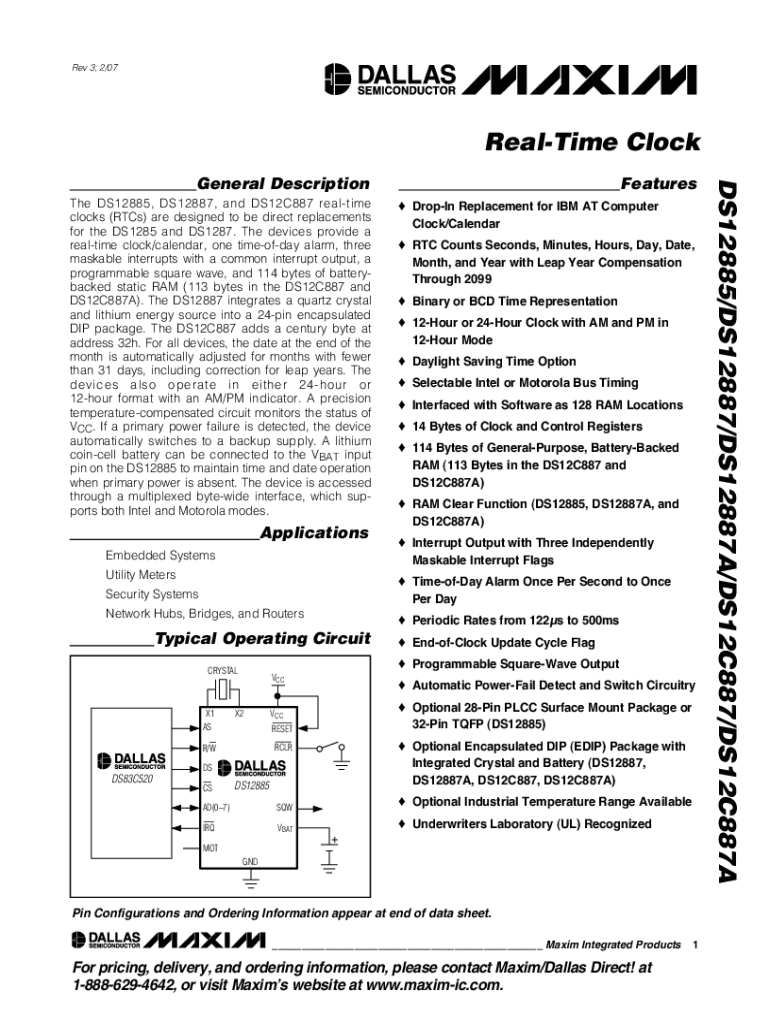 Rev 3; 2/07RealTime Clock The DS12885, DS12887, and DS12C887 realtime clocks (RTCs) are designed to be direct replacements for the DS1285 and DS1287. The devices provide a realtime clock/calendar,