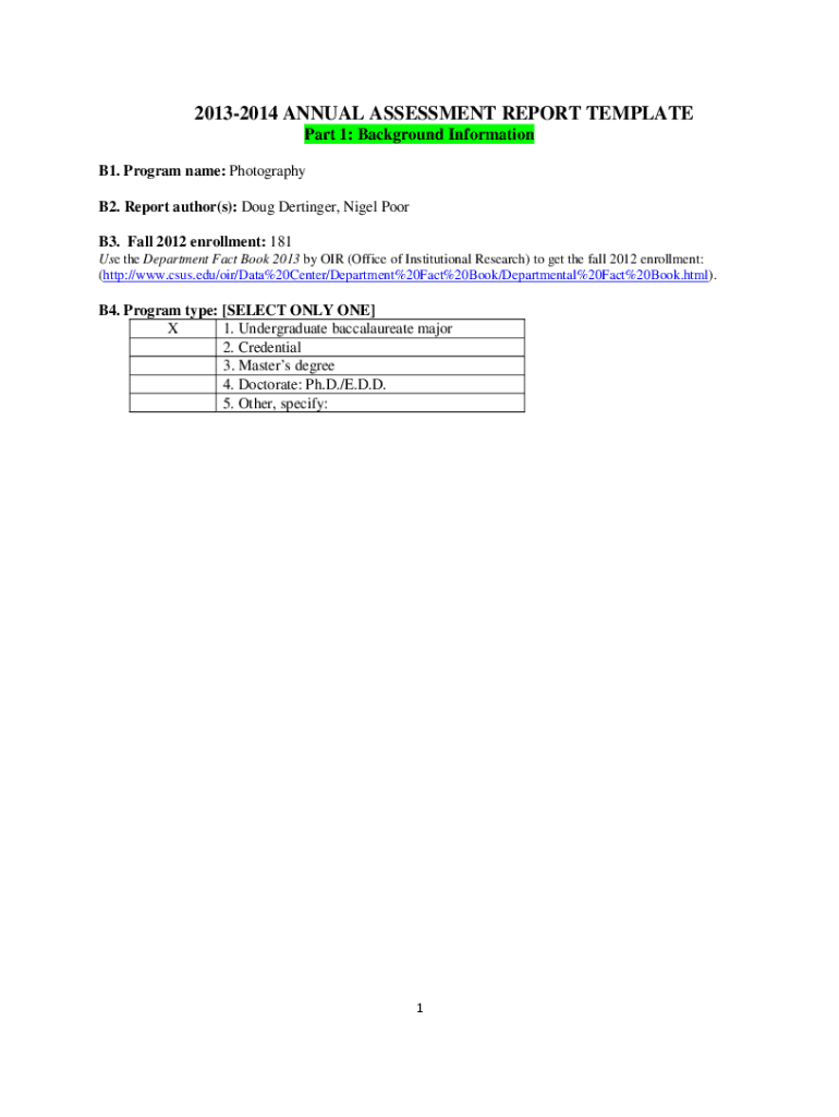 20132014 ANNUAL ASSESSMENT REPORT TEMPLATE Part 1: Background Information B1. Program name: Photography B2. Report author(s): Doug Derringer, Nigel Poor B3. Fall 2012 enrollment: 181 Use the Department