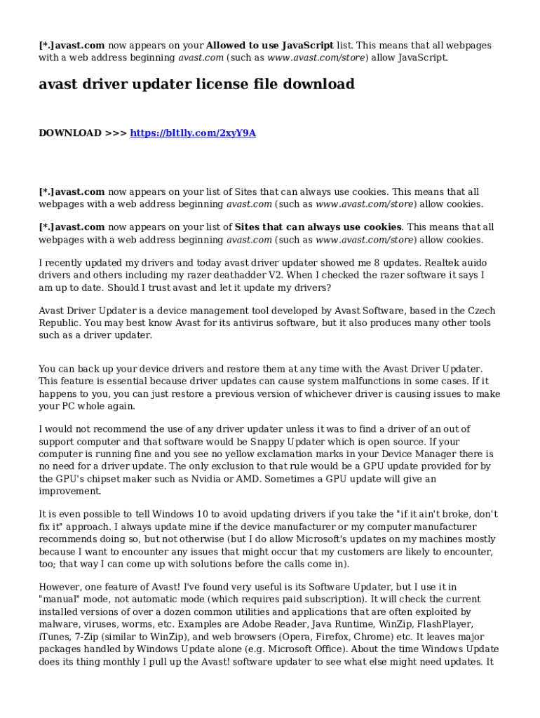 [*.]avast.com now appears on your Allowed to use JavaScript list. This means that all webpages with a web address beginning avast.com (such as www.avast.com/store) allow JavaScript.avast driver updater