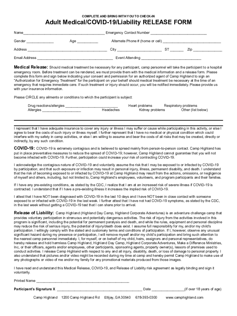 COMPLETE AND BRING WITH YOU TO CHECKINAdult Medical/COVID-19/Liability RELEASE FORM Name___ Emergency Contact Number ___ Gender ___Age ___Alternate Phone # (home or cell) ___Address ___ City ___ ST