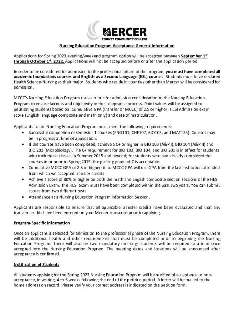 Nursing Education Program Acceptance General Information Applications for Spring 2023 evening/weekend program option will be accepted between September 1st through October 1st, 2022. Applications