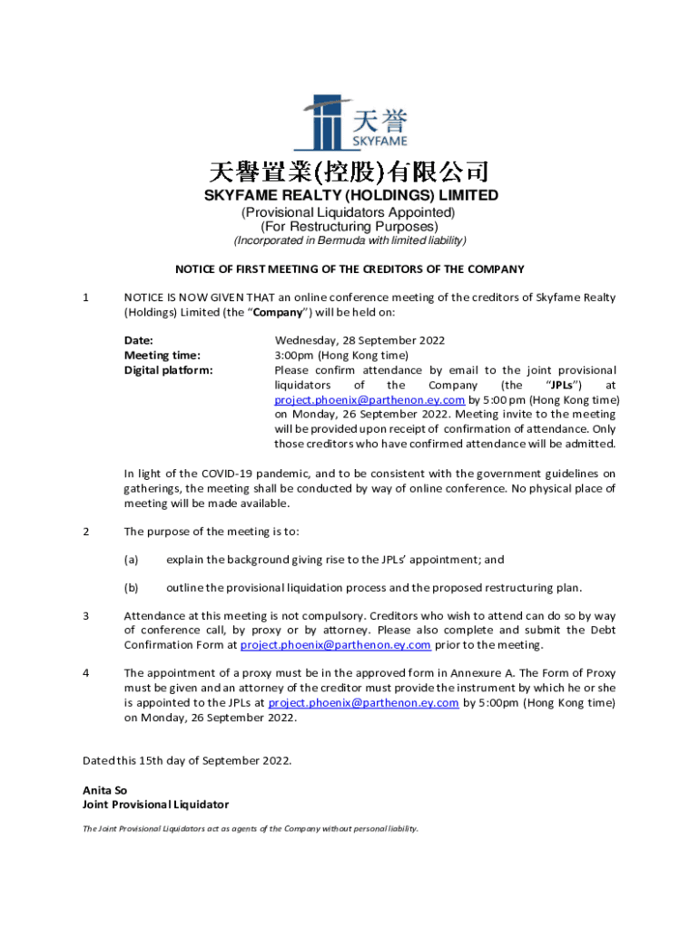 SKYFAME REALTY (HOLDINGS) LIMITED (Provisional Liquidators Appointed) (For Restructuring Purposes) (Incorporated in Bermuda with limited liability)NOTICE OF FIRST MEETING OF THE CREDITORS OF THE COMPANY