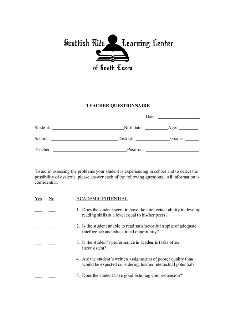 TEACHER QUESTIONNAIRE Date: ___ Student: ___Birthdate: ___Age: ___ School: ___District: ___Grade: ___ Teacher: ___Position: ___To aid in assessing the problems your student is experiencing in school
