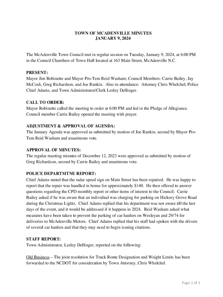 TOWN OF MCADENVILLE MINUTES JANUARY 9, 2024The McAdenville Town Council met in regular session on Tuesday, January 9, 2024, at 6:00 PM in the Council Chambers of Town Hall located at 163 Main Street,