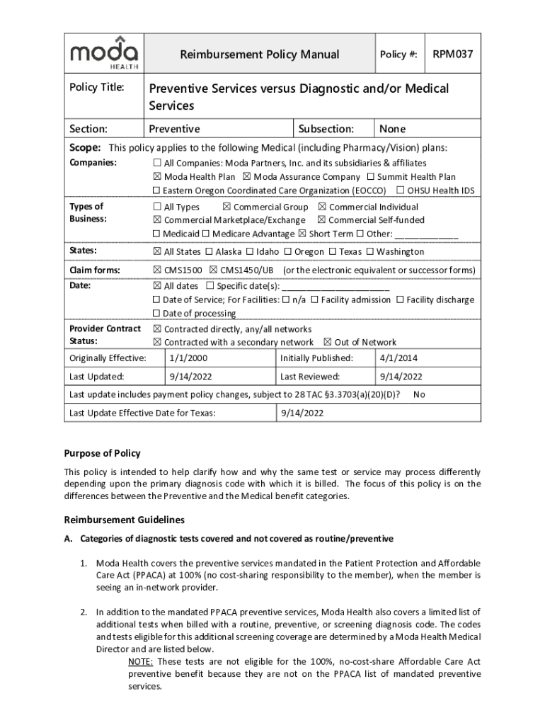 Reimbursement Policy ManualPolicy #:RPM037Policy Title:Preventive Services versus Diagnostic and/or Medical