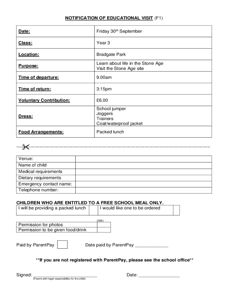 NOTIFICATION OF EDUCATIONAL VISIT (F1) Date:Friday 30th SeptemberClass:Year 3Location:Bradgate ParkPurpose:Learn about life in the Stone Age Visit the Stone Age siteTime of departure:9.00amTime of