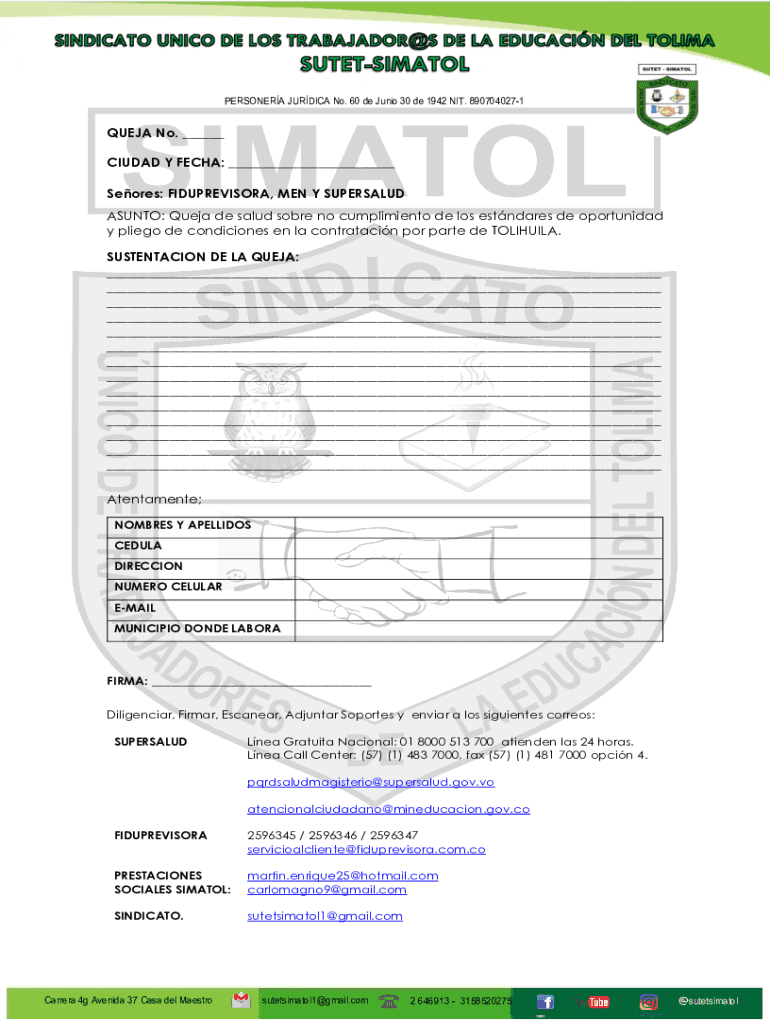 PERSONERA JURDICA No. 60 de Junio 30 de 1942 NIT. 8907040271QUEJA No. ___ CIUDAD Y FECHA: ___ Seores: FIDUPREVISORA, MEN Y SUPERSALUD ASUNTO: Queja de salud sobre no cumplimiento de los estndares