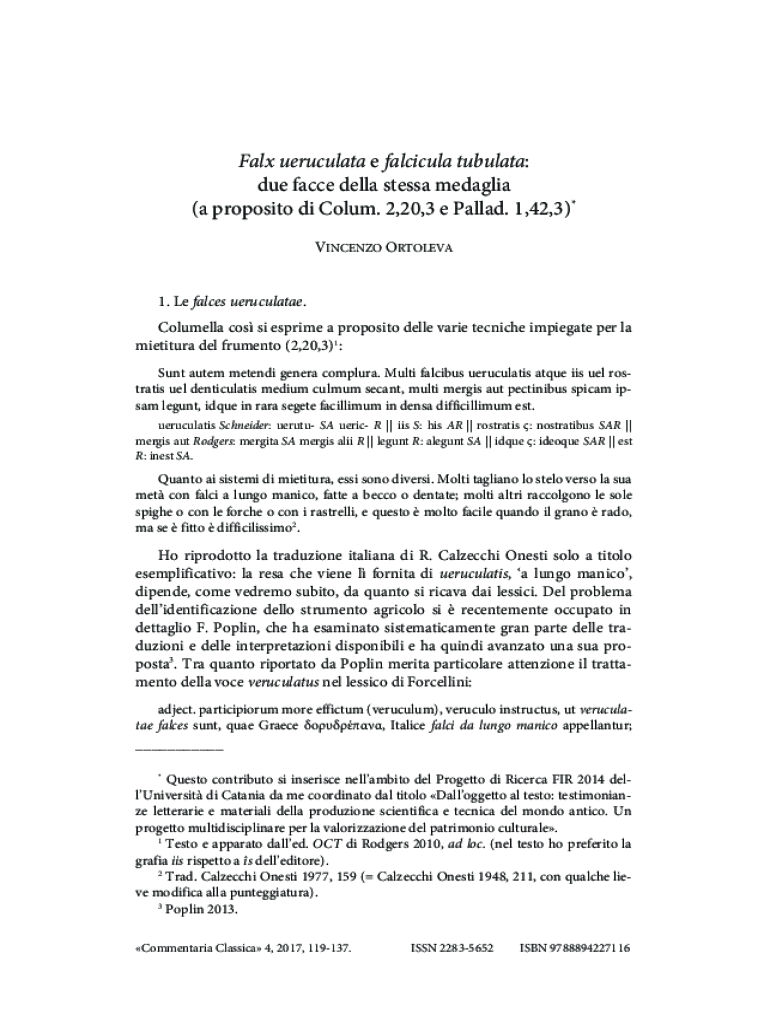 Falx ueruculata e falcicula tubulata: due facce della stessa medaglia (a proposito di Colum. 2,20,3 e Pallad. 1,42,3)* VINCENZO ORTOLEVA1. Le falces ueruculatae. Columella cos si esprime a proposito