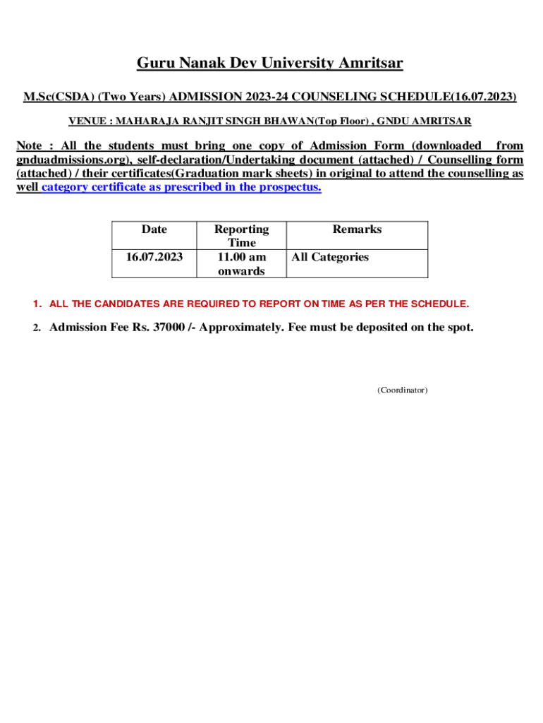 M.Sc.(CSA) (Two Years) ADMISSION 202324 COUNSELING SCHEDULE(16.07.2023)