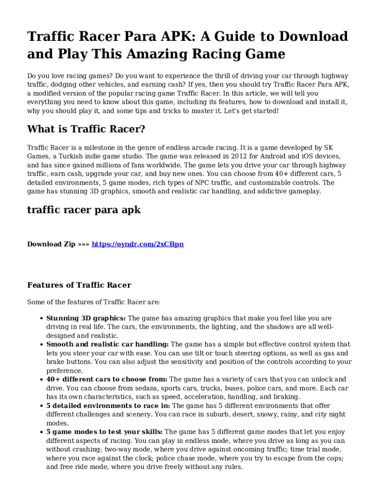 Traffic Racer Para APK: A Guide to Download and Play This Amazing Racing Game Do you love racing games? Do you want to experience the thrill of driving your car through highway traffic, dodging other