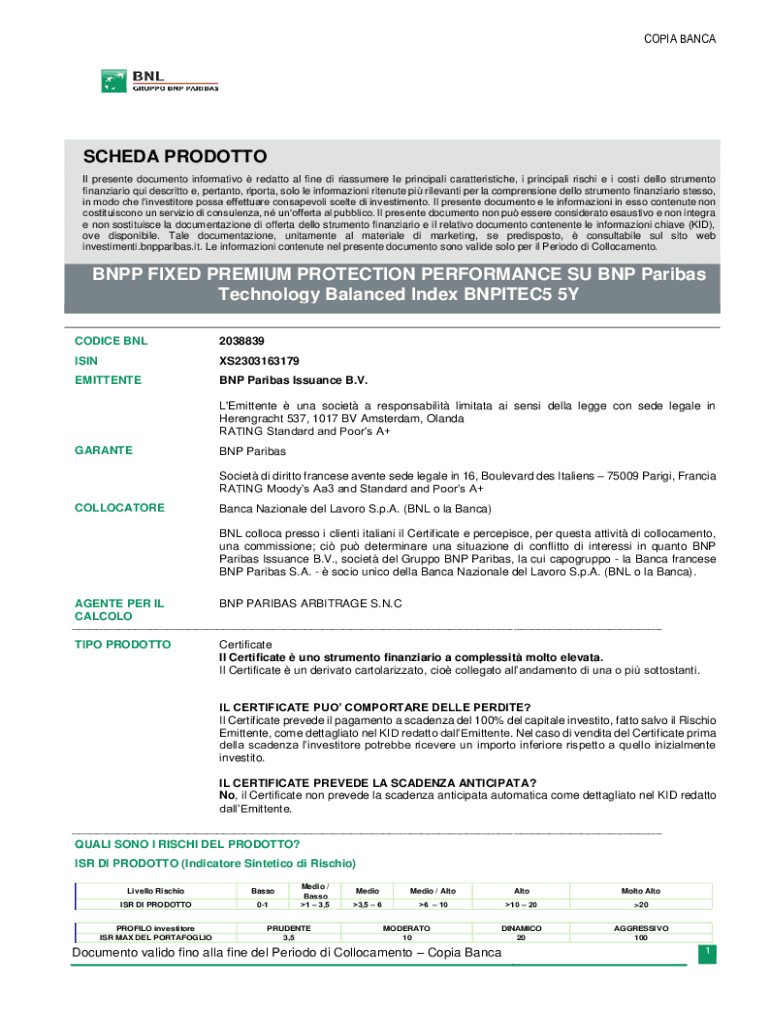 Per compilare la scheda prodotto BNPP Fixed, è necessario seguire le linee guida fornite da BNP Paribas e includere tutte le informazioni richieste su caratteristiche, condizioni e rischi del prodotto.