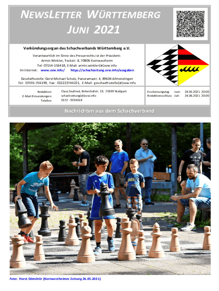 NEWSLETTER WRTTEMBERG JUNI 2021 Verkndungsorgan des Schachverbands Wrttemberg e.V. Verantwortlich im Sinne des Presserechts ist der Prsident: Armin Winkler, Teckstr. 8, 70806 Kornwestheim Tel: 07154156418,