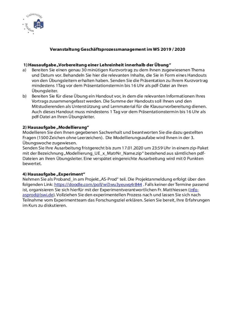 Veranstaltung Geschftsprozessmanagement im WS 2019 / 2020 1) Hausaufgabe Vorbereitung einer Lehreinheit innerhalb der bung a) Bereiten Sie einen genau 30 mintigen Kurzvortrag zu dem Ihnen zugewiesenen