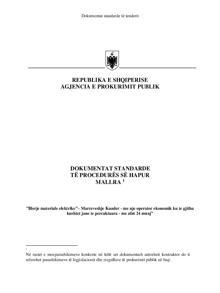 Dokumentat standarde t tenderitREPUBLIKA E SHQIPERISE AGJENCIA E PROKURIMIT PUBLIKDOKUMENTAT STANDARDE T PROCEDURS S HAPUR MALLRA 1Blerje materiale elektrike Marreveshje Kuader me nje operator ekonomik