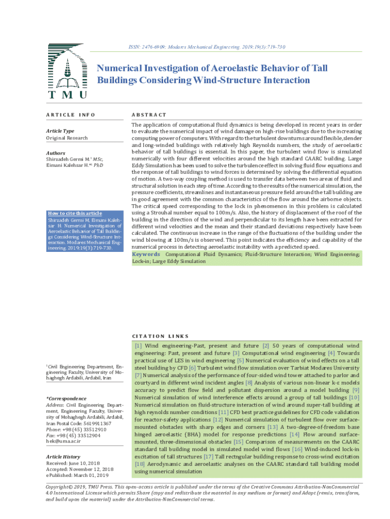 ISSN: 24766909; Modares Mechanical Engineering. 2019;19(3):719730Numerical Investigation of Aeroelastic Behavior of Tall Buildings Considering WindStructure InteractionARTICLE INFO Article Type Original