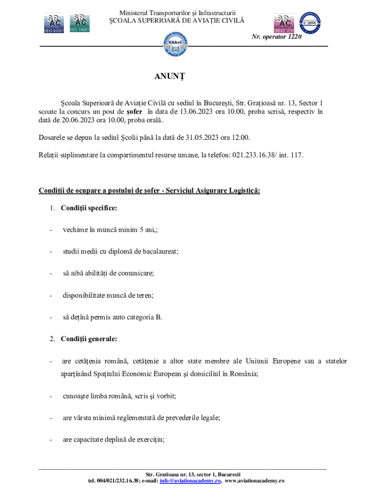 Ministerul Transporturilor i Infrastructurii COALA SUPERIOAR DE AVIAIE CIVIL Nr. operator 1220 ______ANUN coala Superioar de Aviaie Civil cu sediul n Bucureti, Str. Graioas nr. 13, Sector 1 scoate
