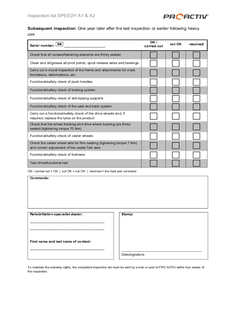 Inspection list SPEEDY A1 & A2 Subsequent inspection: One year later after the last inspection or earlier following heavy use Serial number:OK / carried out___not OKresolvedCheck that all screws/fastening