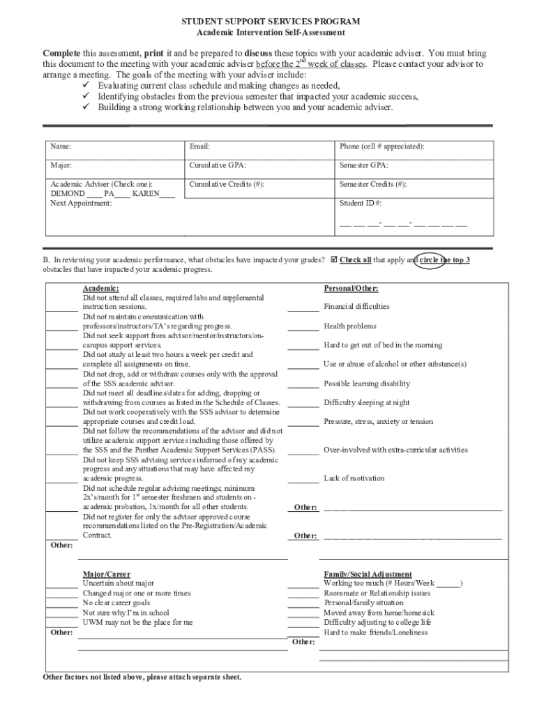 STUDENT SUPPORT SERVICES PROGRAM Academic Intervention SelfAssessmentComplete this assessment, print it and be prepared to discuss these topics with your academic adviser. You must bring this document