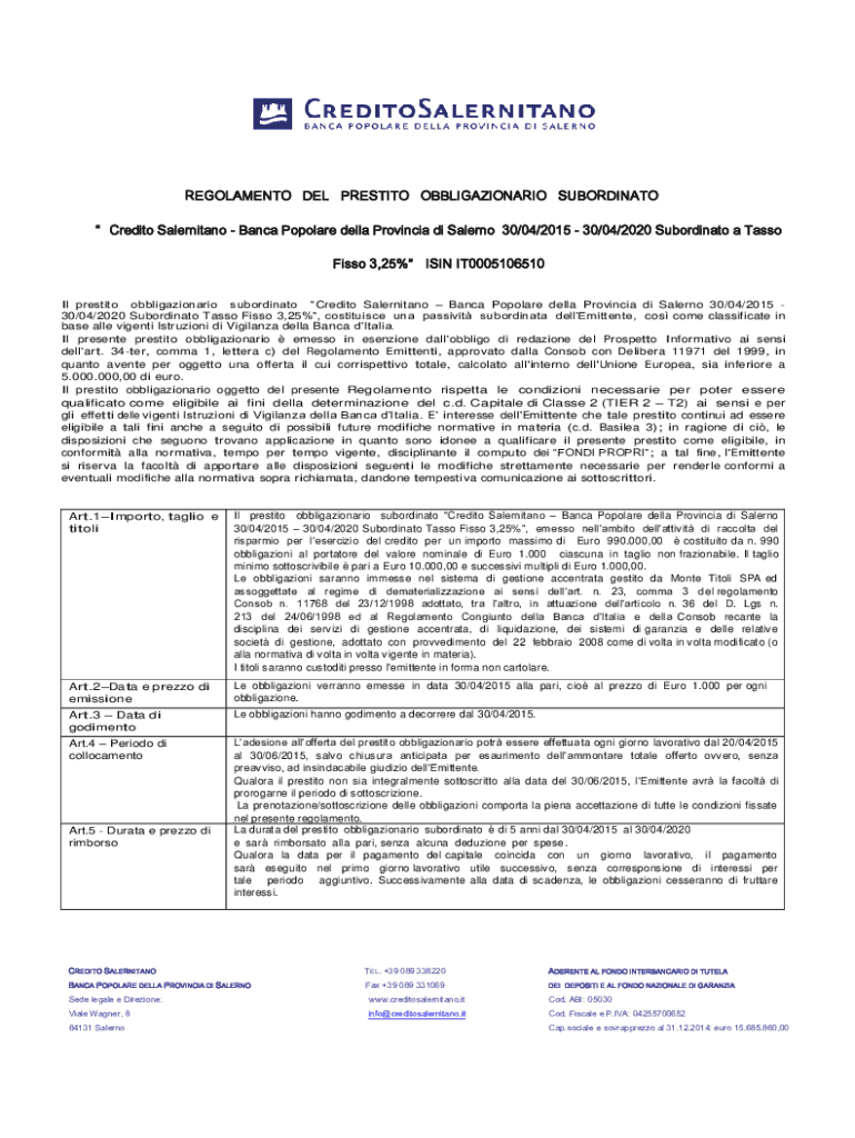 REGOLAMENTO DEL PRESTITO OBBLIGAZIONARIO SUBORDINATO Credito Salernitano Banca Popolare della Provincia di Salerno 30/04/2015 30/04/2020 Subordinato a Tasso Fisso 3,25% ISIN IT0005106510 Il prestito