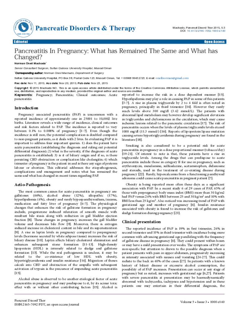 DOI: 10.4172/21657092.1000 e140ISSN: 21657092EditorialOpen AccessPancreatitis In Pregnancy: What
