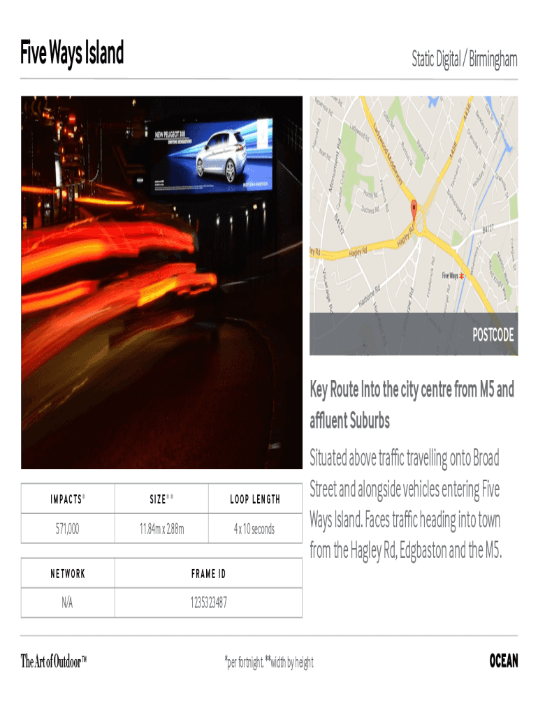 Five Ways IslandStatic Digital / BirminghamPOSTCODEI M PA C T S *SIZE**LOOP LENGTH571,00011.84 m × 2.88m4 x 10 secondsNETWORKFRAME IDN/A1235323487Key Route Into the city center from M5 and
