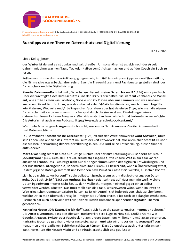 Frauenhauskoordinierung e.V. I Tucholskystrae 11 I DE10117 Berlin I 03033843420 I Fax 030338434219 I info@frauenhauskoordinierung.deBuchtipps zu den Themen Datenschutz und Digitalisierung 07.12.2020