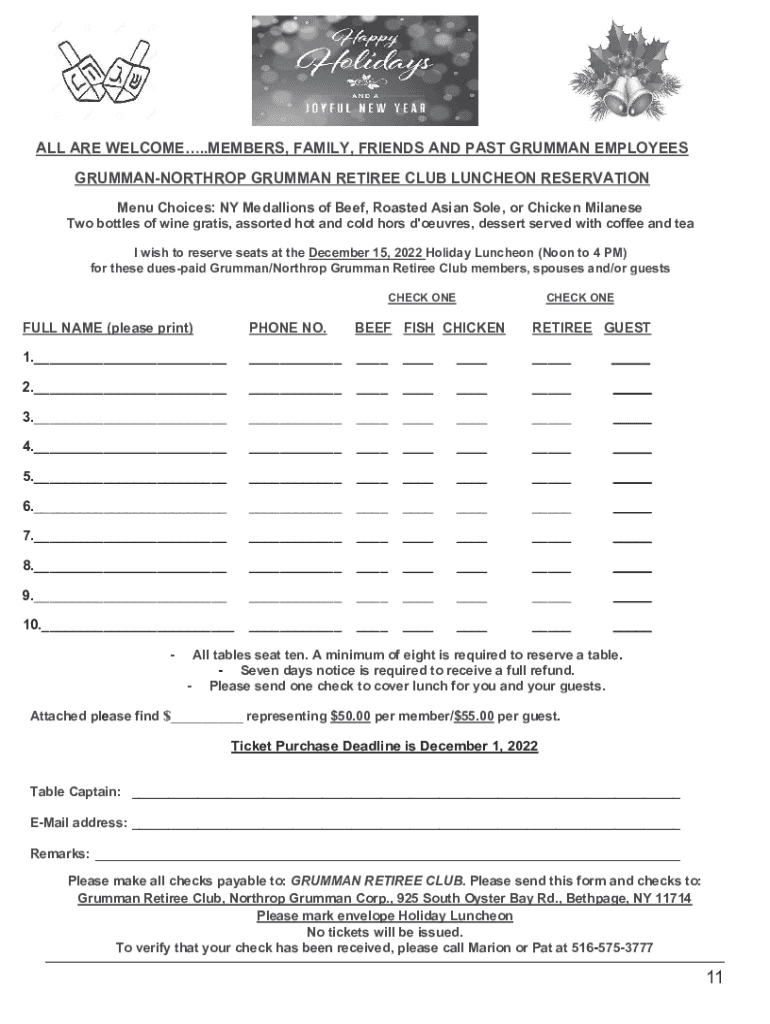 ALL ARE WELCOME..MEMBERS, FAMILY, FRIENDS AND PAST GRUMMAN EMPLOYEES ALL ARE WELCOME..MEMBERS, FAMILY, FRIENDS AND PAST GRUMMAN EMPLOYEES GRUMMANNORTHROP GRUMMAN RETIREE CLUB LUNCHEON RESERVATION