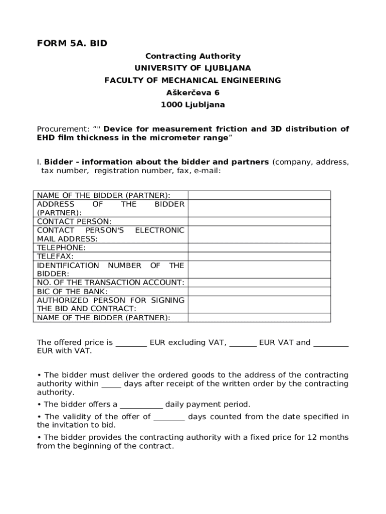 The 5A. BID is a fillable form in MS Word extension that should be submitted to the specific address in order to provide some information. It has to be completed and signed, which is possible manually in hard copy, or via a certain solution like PDFfiller. This tool helps to fill out any PDF or Word document directly from your browser (no software requred), customize it depending on your needs and put a legally-binding electronic signature. Right away after completion, you can easily send the 5A. BID to the relevant person, or multiple ones via email or fax. The blank is printable as well due to PDFfiller feature and options presented for printing out adjustment. Both in electronic and physical appearance, your form will have a organized and professional outlook. It's also possible to turn it into a template to use later, so you don't need to create a new file again. All that needed is to amend the ready sample.