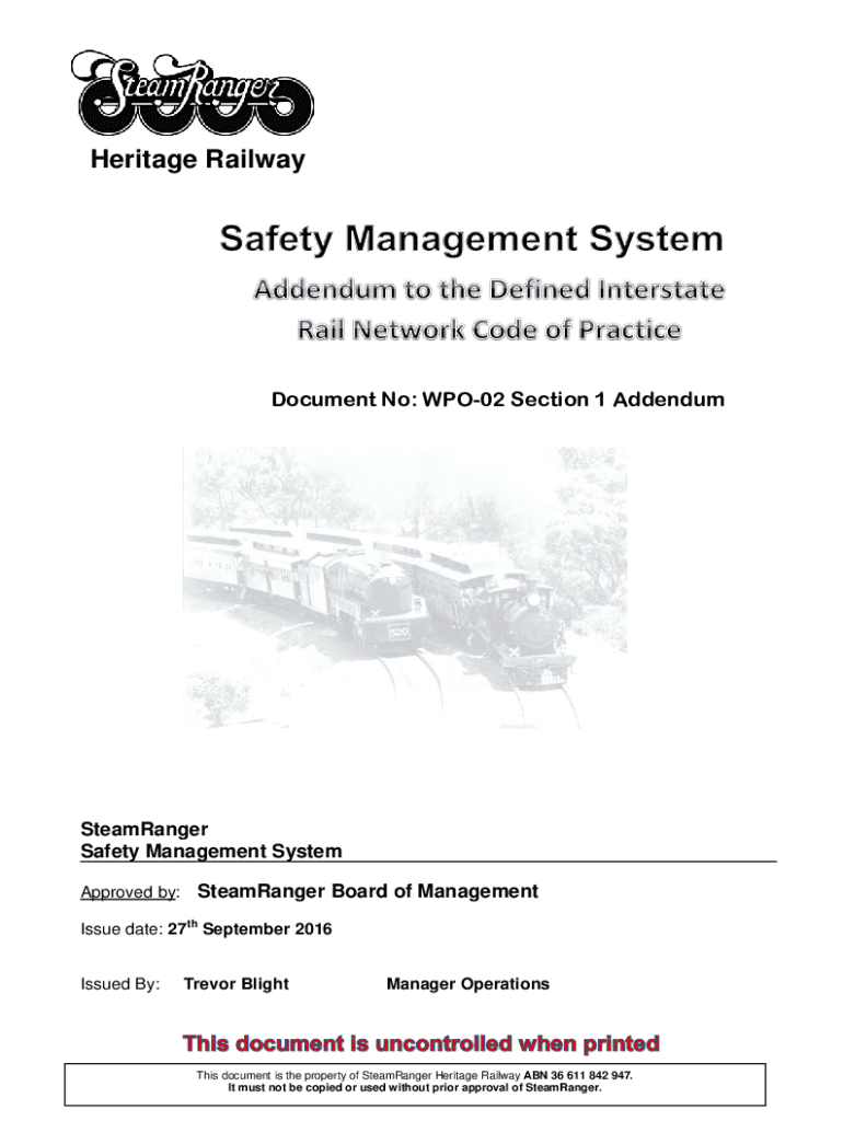 WPO02Heritage RailwayDocument No: WPO02 Section 1 AddendumSteamRanger Safety Management System Approved by:SteamRanger Board of ManagementIssue date: 27th September 2016Issued By:Trevor BlightManager