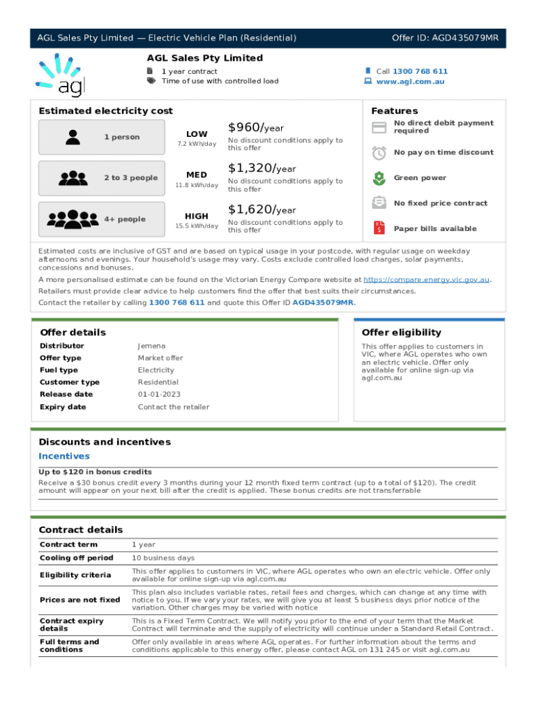 AGL Sales Pty Limited Electric Vehicle Plan (Residential)Offer ID: AGD435079MRAGL Sales Pty Limited1 year contractile of use with controlled loadEstimated electricity catcall 1300 768 611www.agl.com.features