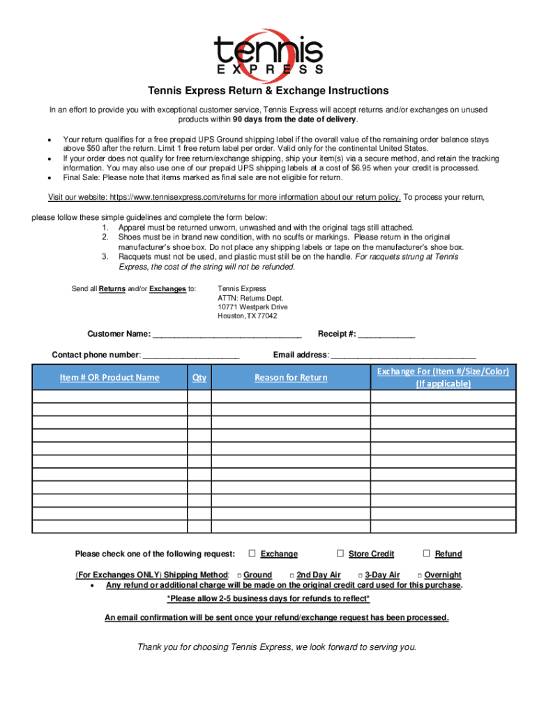 In an effort to provide you with exceptional customer service, Tennis Express will accept returns and/or exchanges on unused
