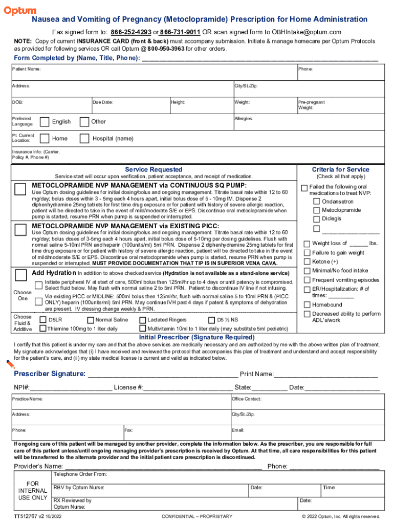 Nausea and Vomiting of Pregnancy () Prescription for Home Administration Fax signed form to: 8662524293 or 8667319011 OR scan signed form to OBHIntake@optum.com NOTE: Copy of current INSURANCE CARD