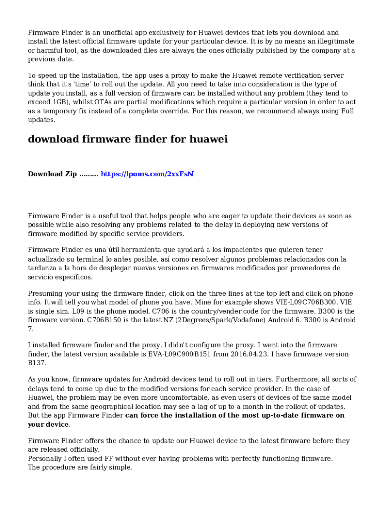 Firmware Finder is an unofficial app exclusively for Huawei devices that lets you download and install the latest official firmware update for your particular device. It is by no means an illegitimate