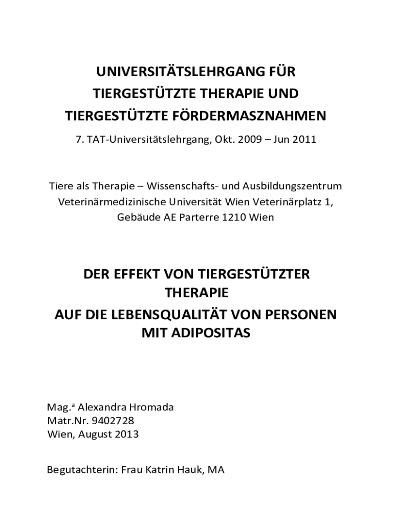UNIVERSITTSLEHRGANG FR TIERGESTTZTE THERAPIE UND TIERGESTTZTE FRDERMASZNAHMEN 7. TATUniversittslehrgang, Okt. 2009 Jun 2011Tiere als Therapie Wissenschafts und Ausbildungszentrum Veterinrmedizinische