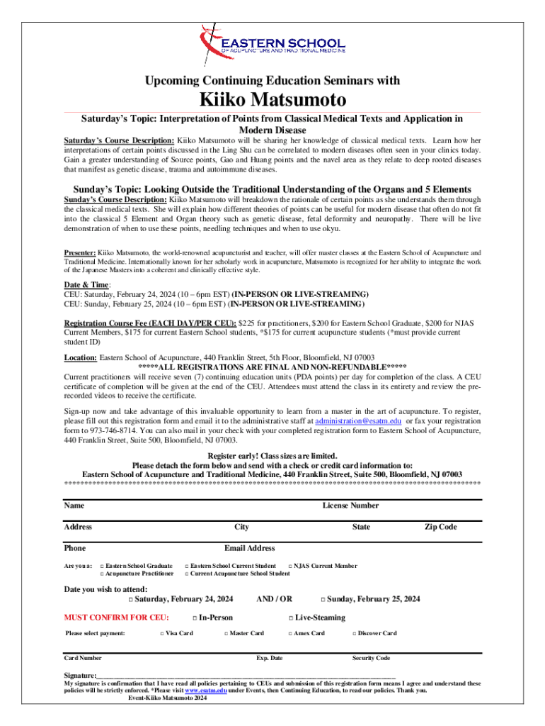 Upcoming Continuing Education Seminars withKiiko Matsumoto Saturdays Topic: Interpretation of Points from Classical Medical Texts and Application in Modern Disease Saturdays Course Description: Kiiko