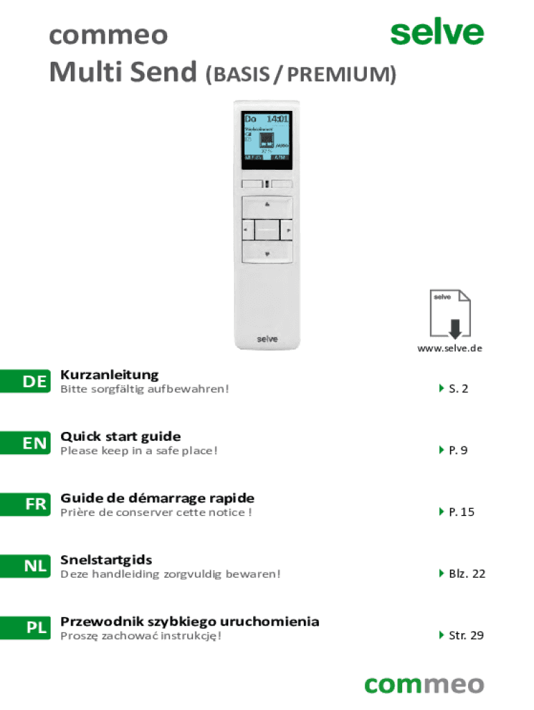 commeo Multi Send (BASIS/PREMIUM)www.selve.deDEKurzanleitungENQuick start guidePlease keep in a safe place!P. 9FRGuide de dmarrage rapide Prire de conserver cette notice !P. 15NLSnelstartgidsDeze